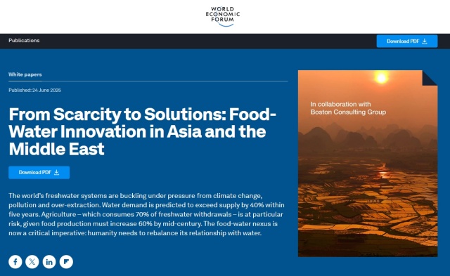 世界經濟論壇(World Economic Forum)于 2025 年 6 月 24 日發布的一份白皮書《From Scarcity to Solutions: Food-Water Innovation in Asia and the Middle East》(從稀缺到解決方案:亞洲與中東的糧食-水資源創新),由世界經濟論壇與波士頓咨詢公司(Boston Consulting Group)合作發布。報告強調,糧食-水資源聯動(food-water nexus)已經成為一個關鍵的緊迫議題:
